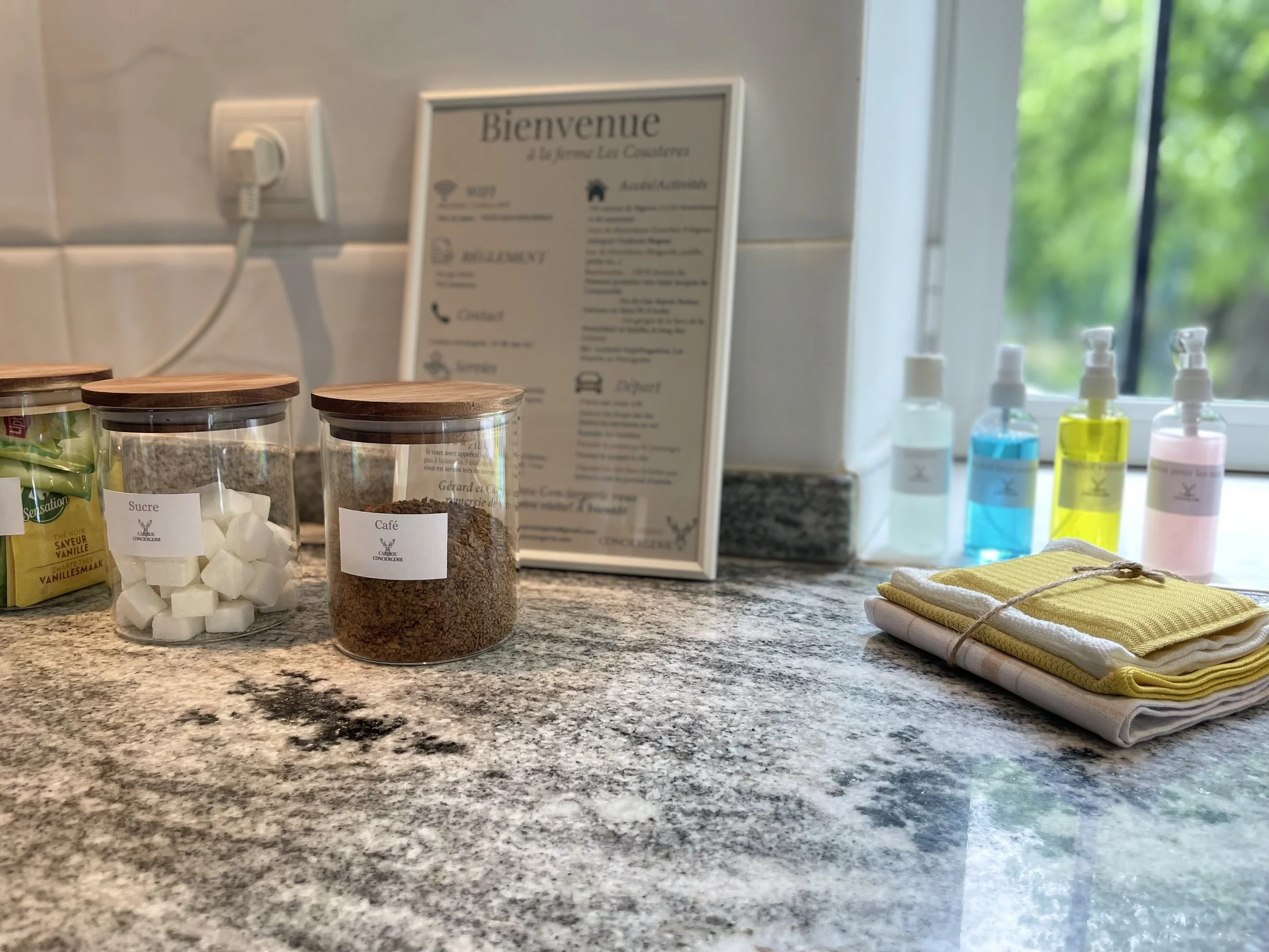 - - Consommables : thé, café, produits ménagés, torchon etc…